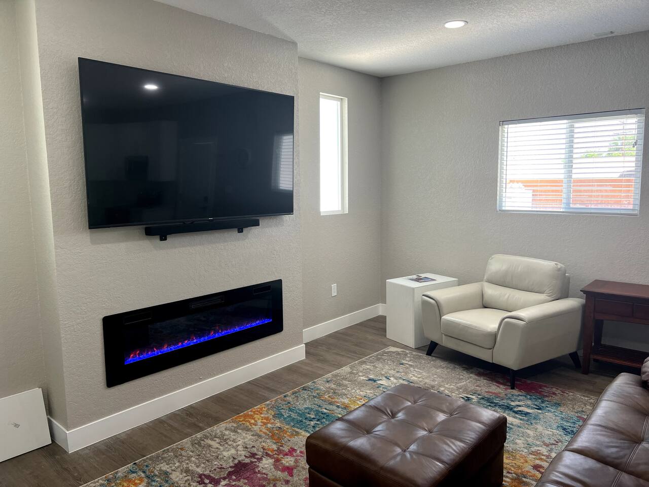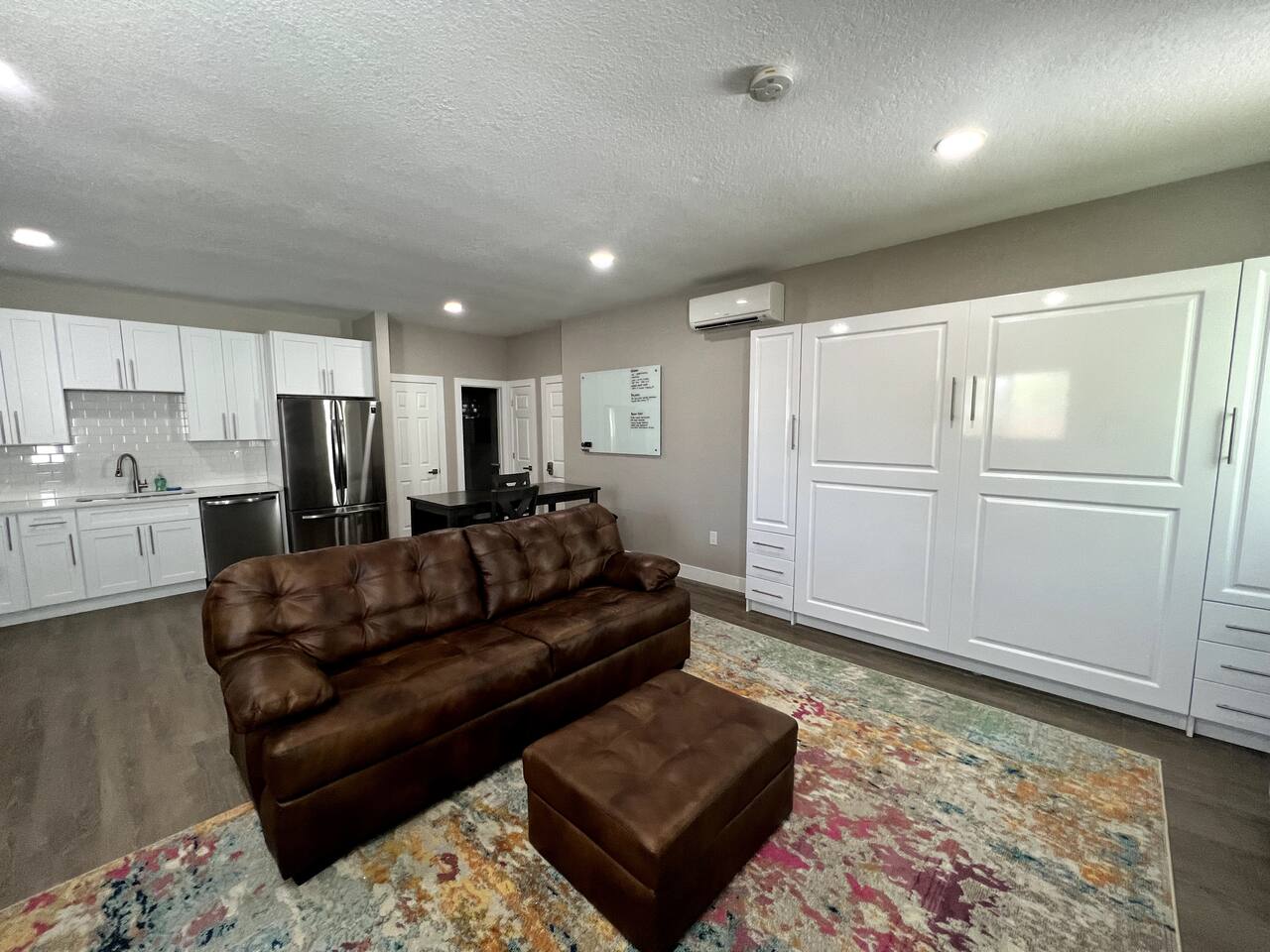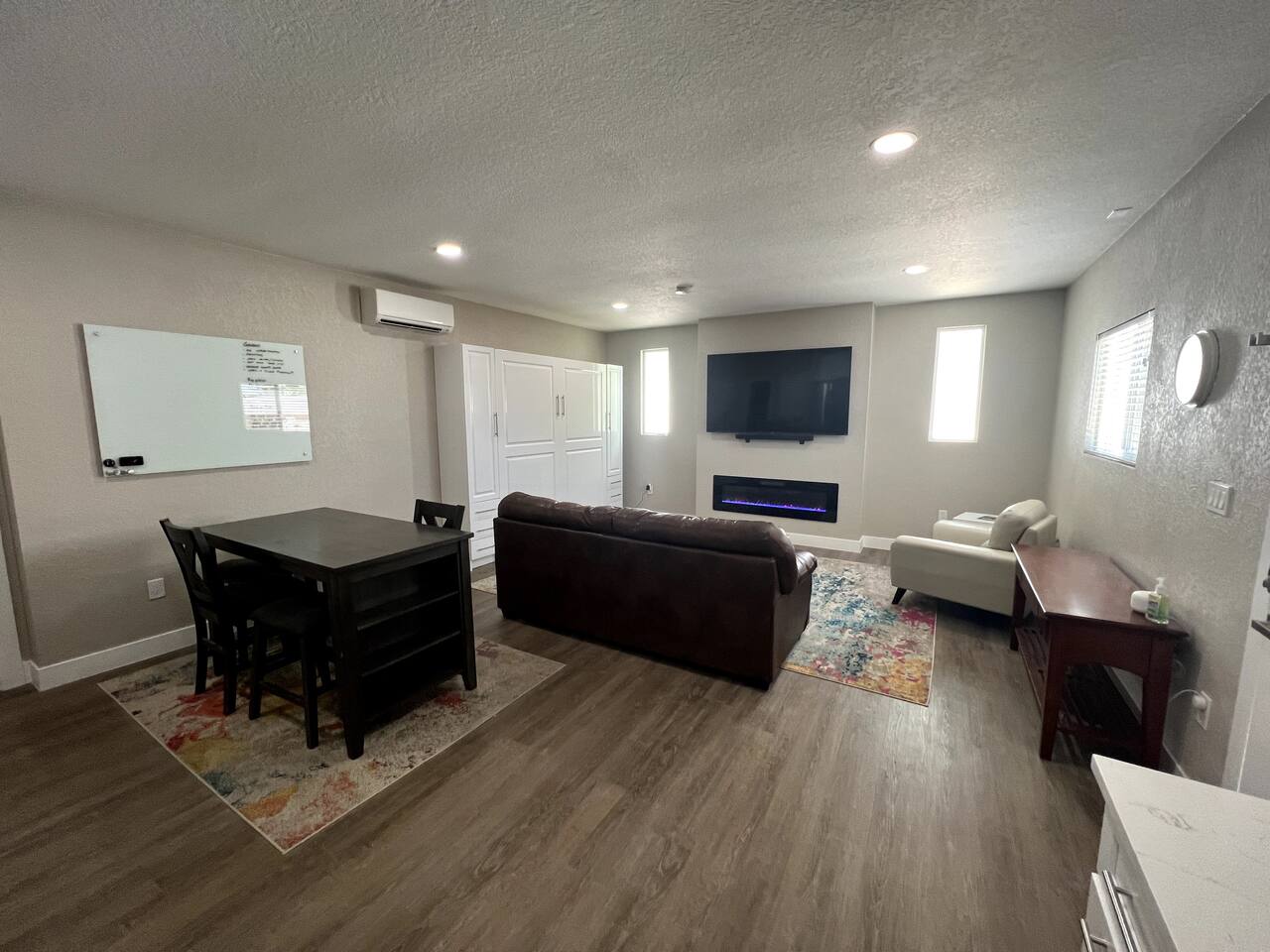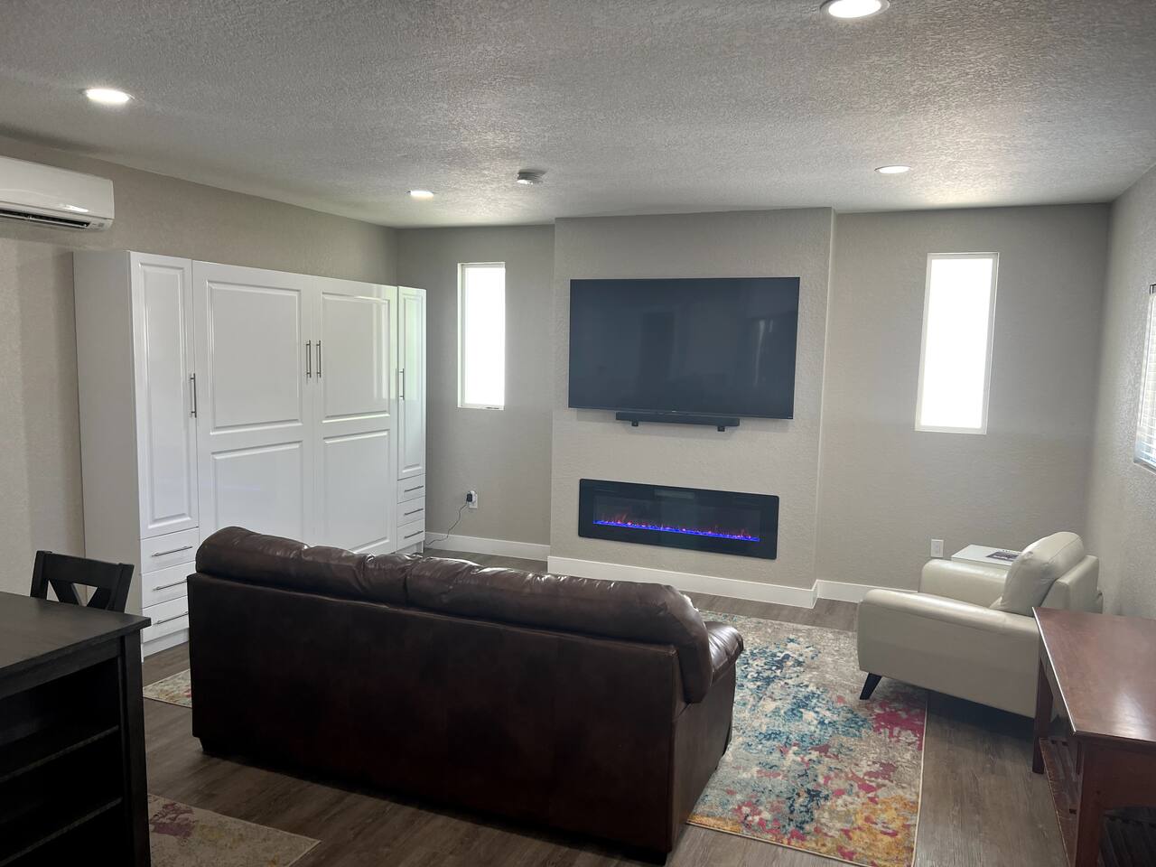 This cozy modern studio has everything you need for a comfortable and enjoyable stay! The space provides a comfortable couch and lounge chair overlooking an electric fireplace and large TV. There is also a full kitchen and bathroom as well as a comfortable Murphy bed that can be easily tucked away when not in use.