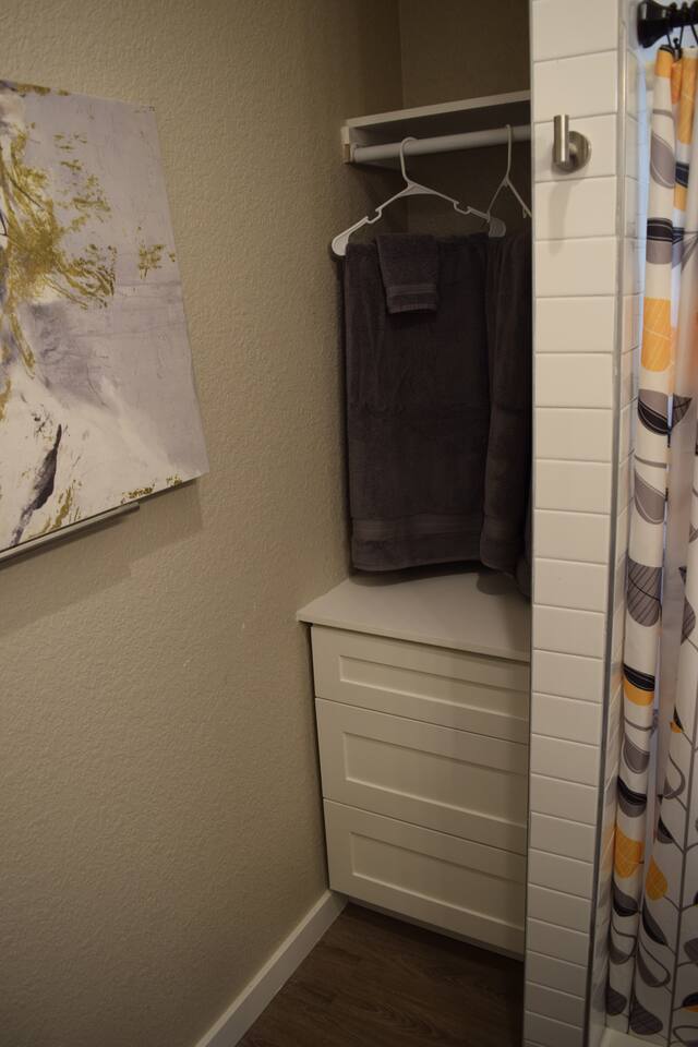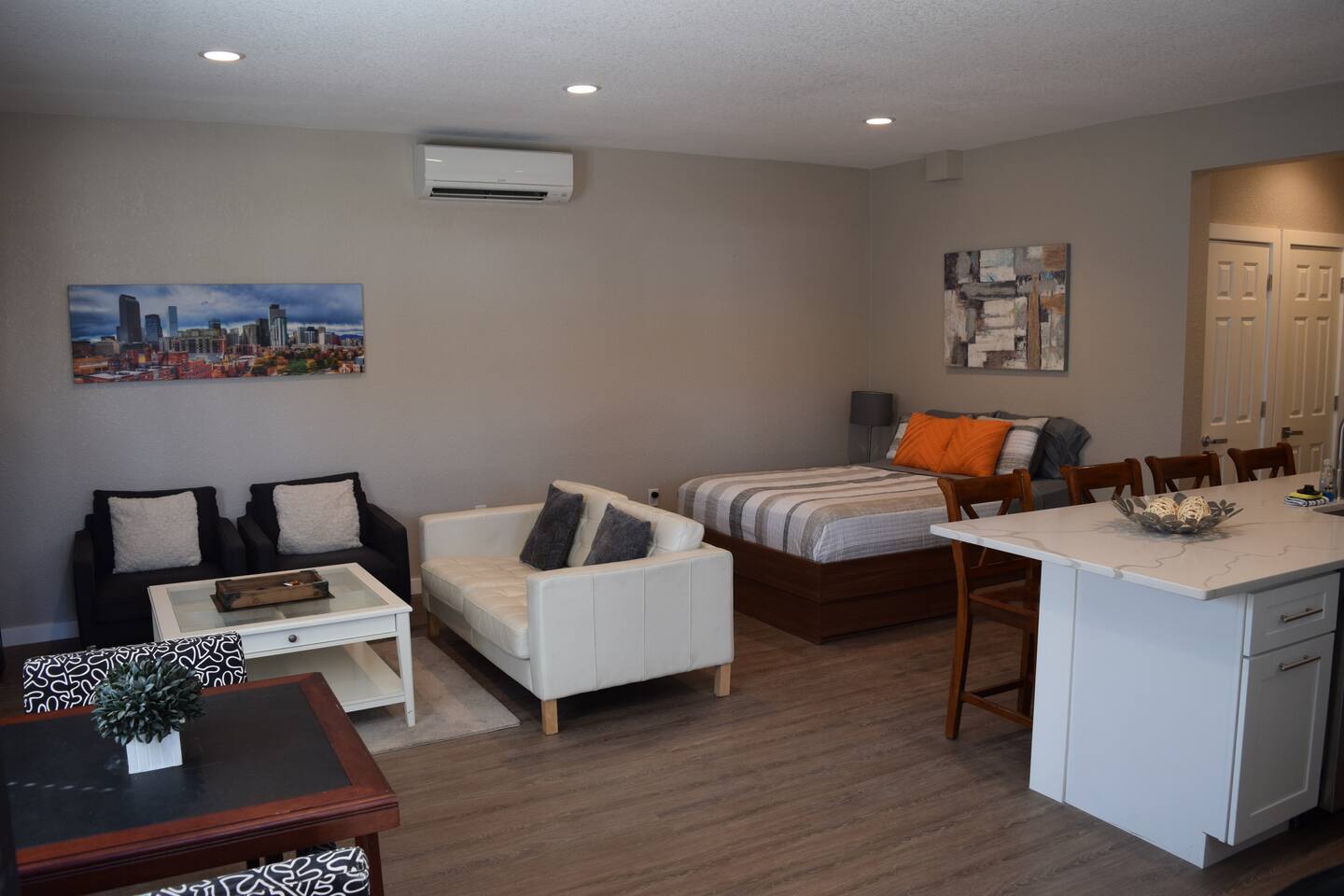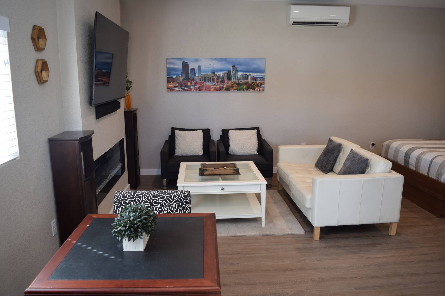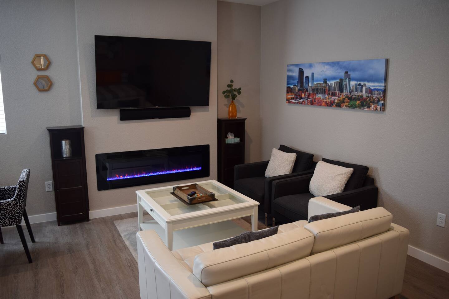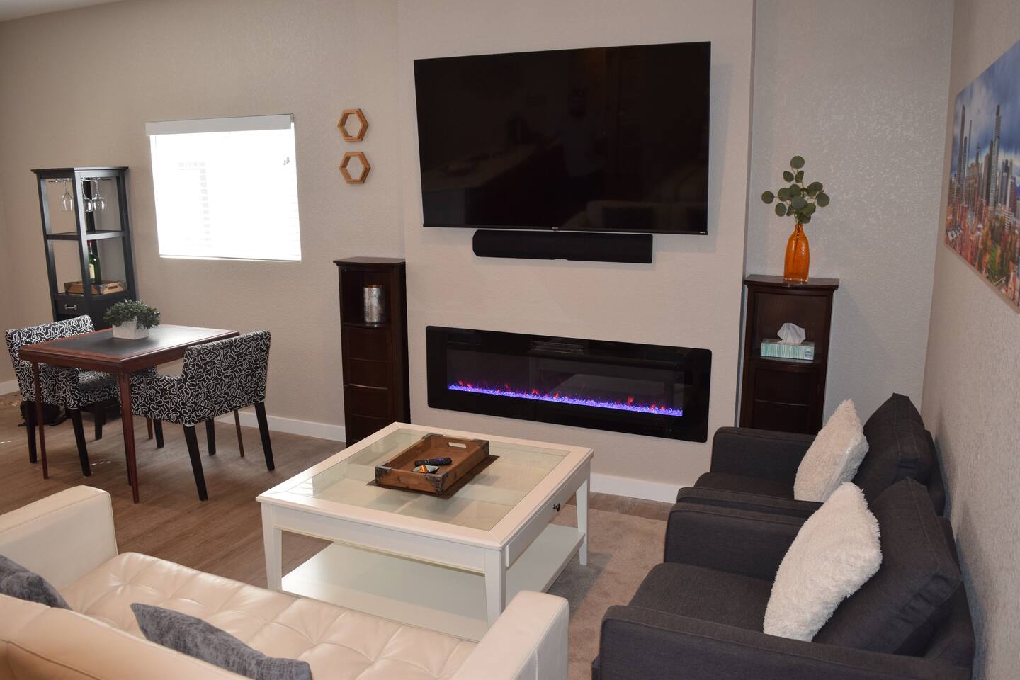 Kick back and relax in this calm, stylish space. The smart Roku TV with Vizio sound bar sit above an electric fireplace. The TV gives you access to all your steaming services. The full kitchen gives you the option to cook, or with the central location you can choose from the many nearby restaurants and bars. There is an awesome queen sized bed and large bathroom with a shower. The desk and monitor gives you the ability to work during your stay.