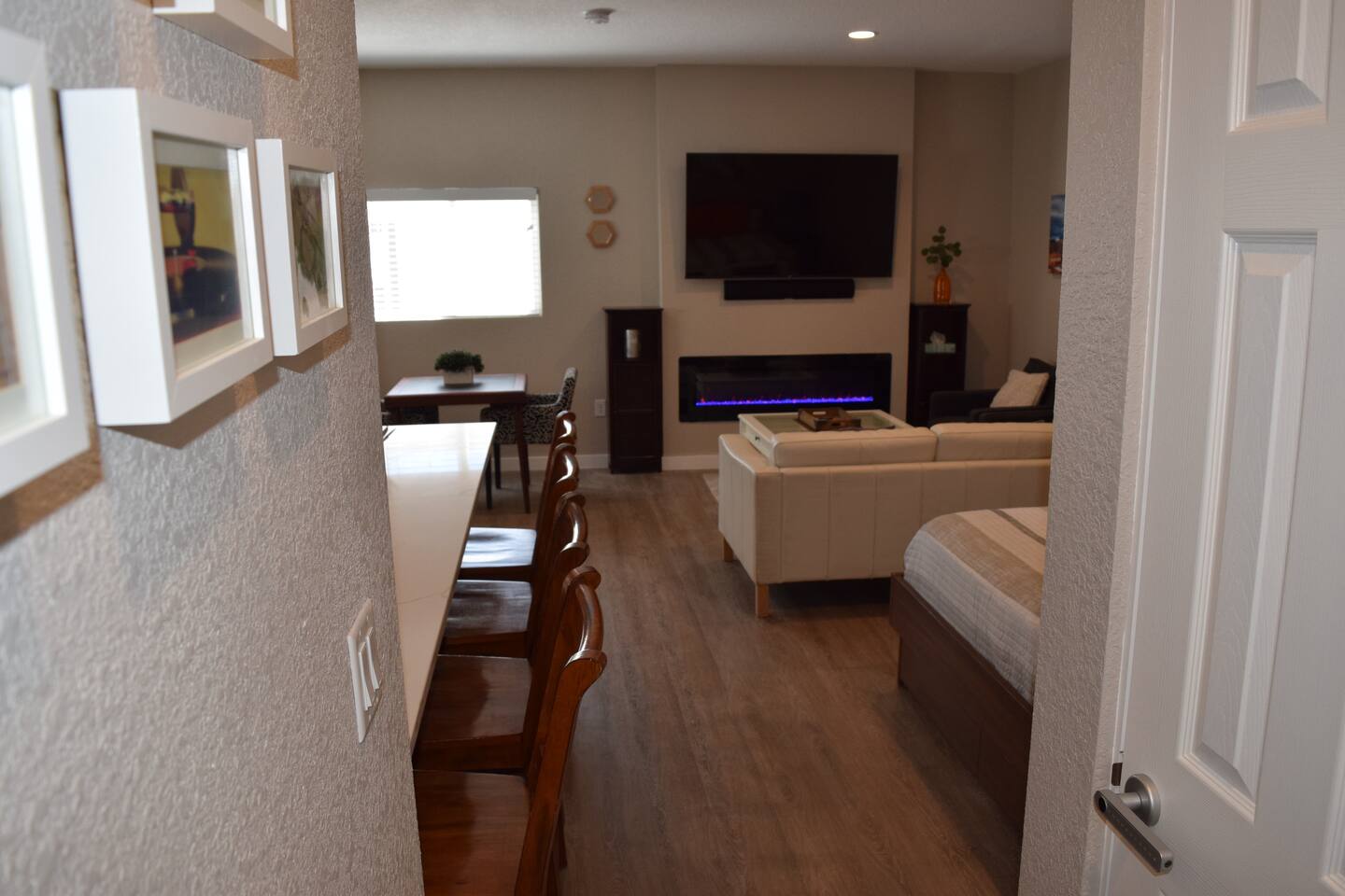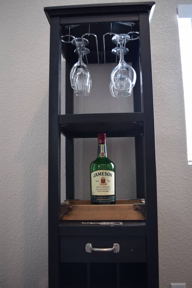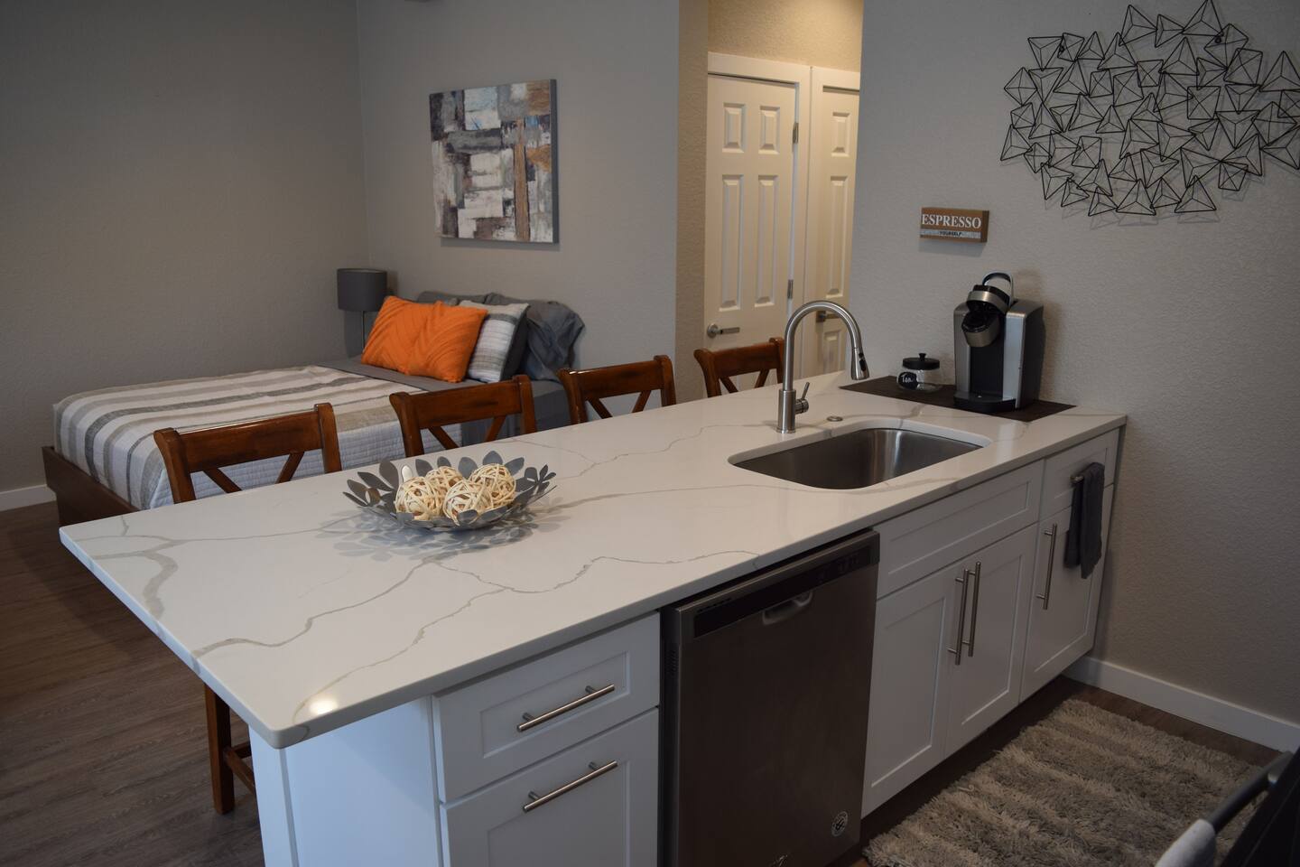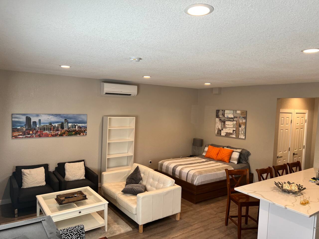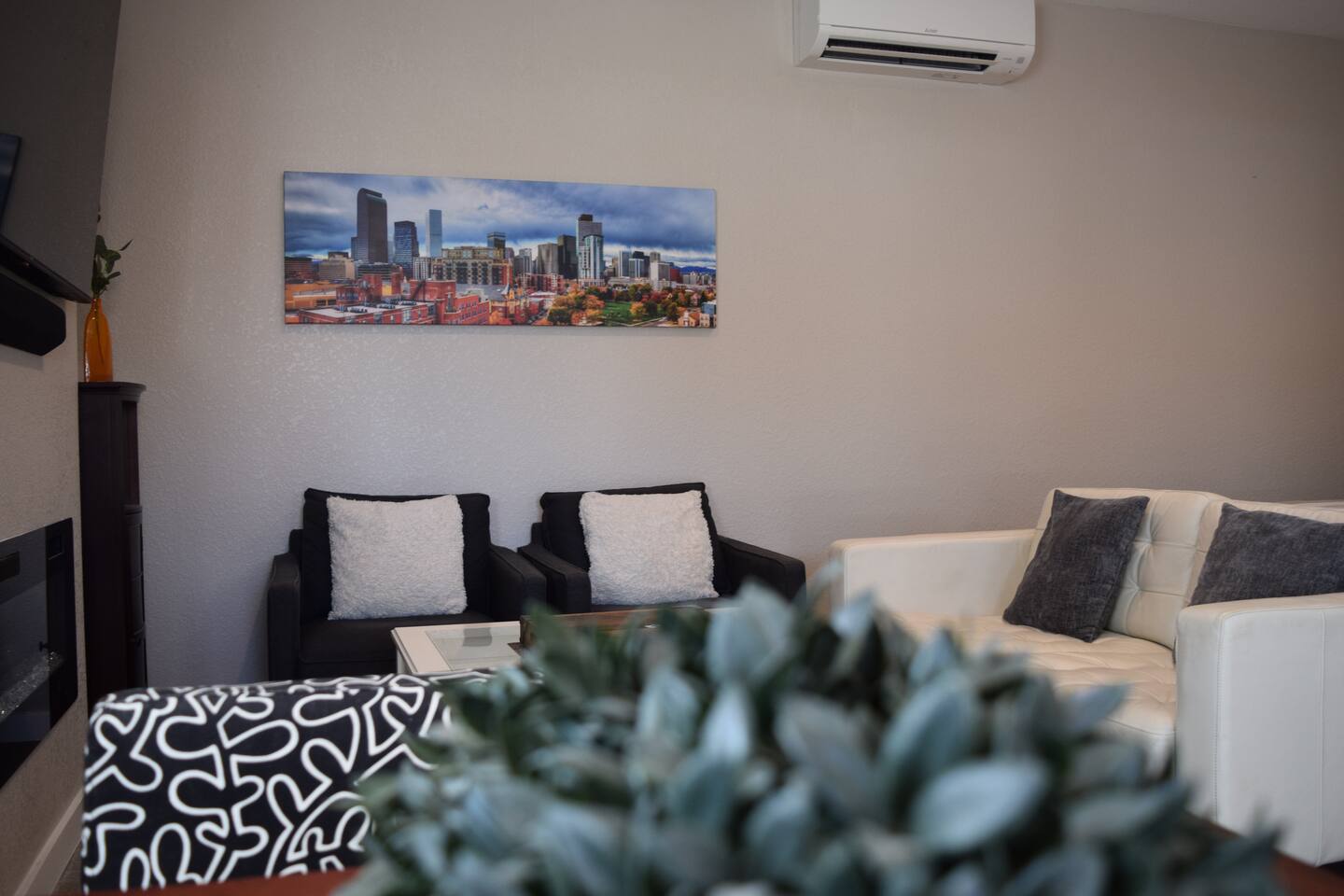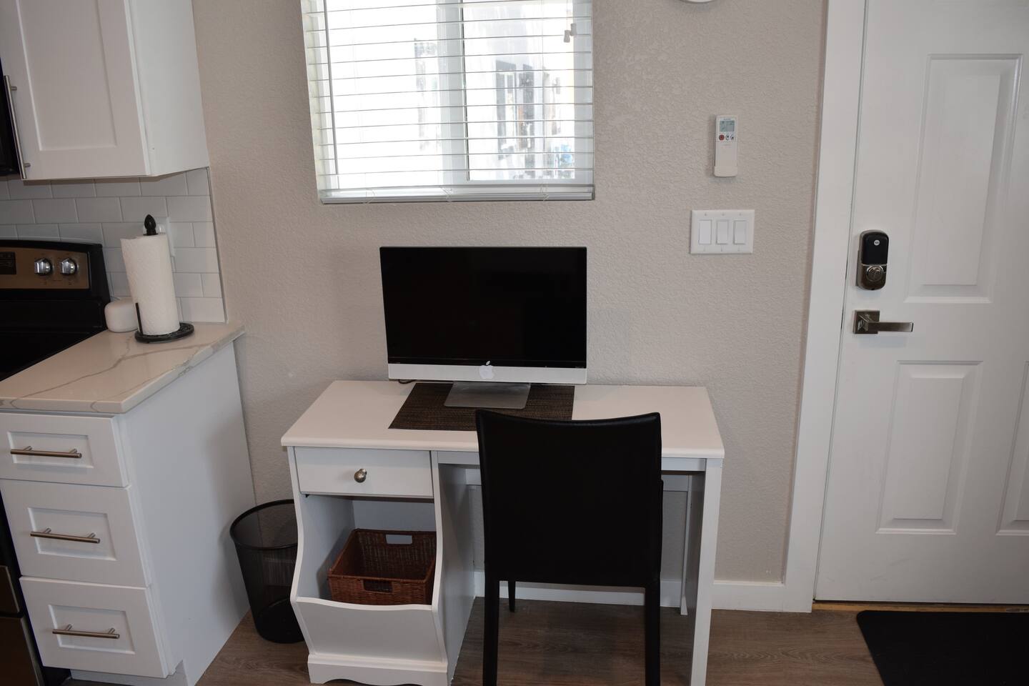 Kick back and relax in this calm, stylish space. The smart Roku TV with Vizio sound bar sit above an electric fireplace. The TV gives you access to all your steaming services. The full kitchen gives you the option to cook, or with the central location you can choose from the many nearby restaurants and bars. There is an awesome queen sized bed and large bathroom with a shower. The desk and monitor gives you the ability to work during your stay.