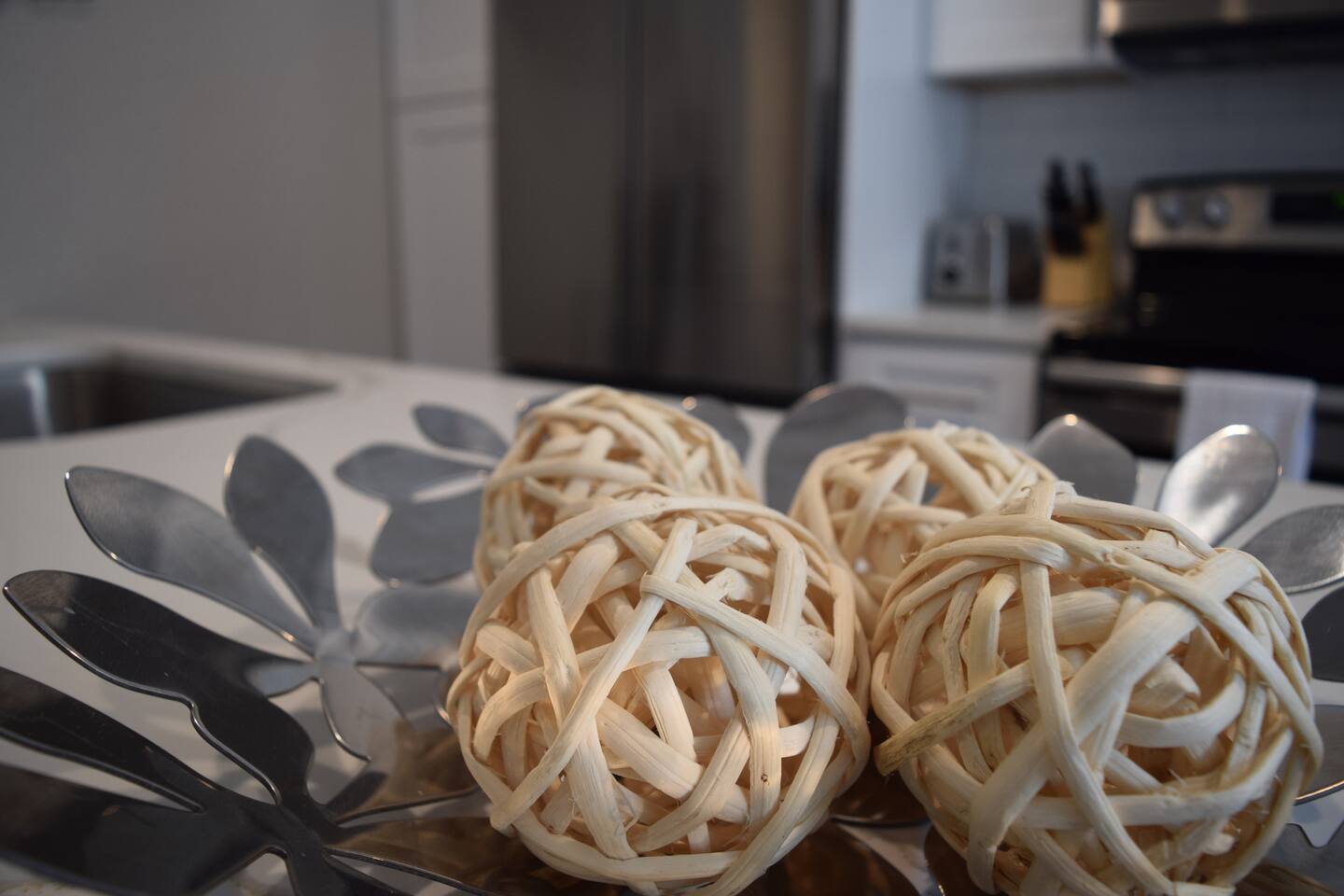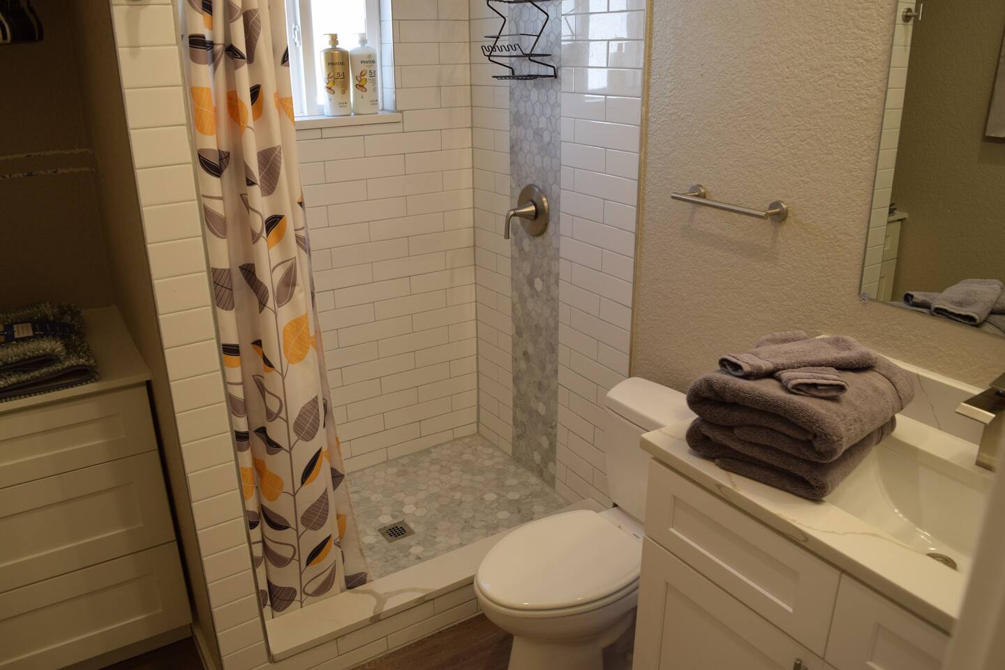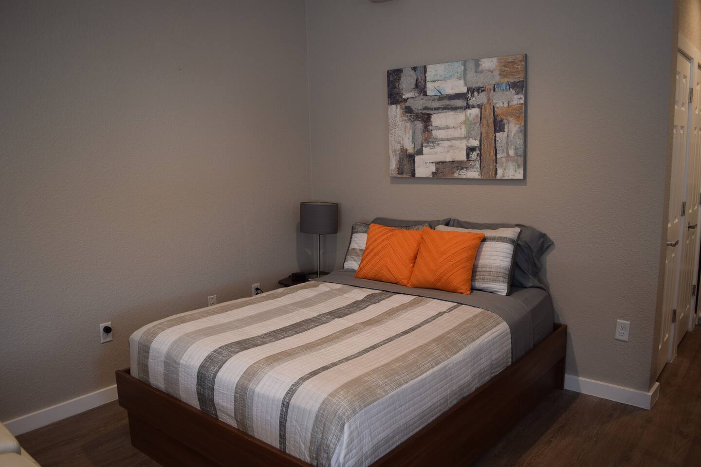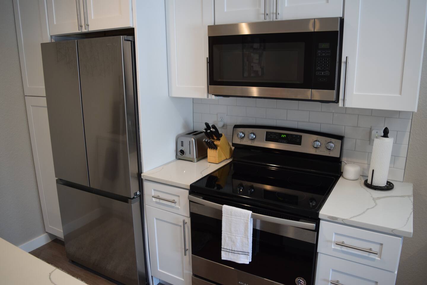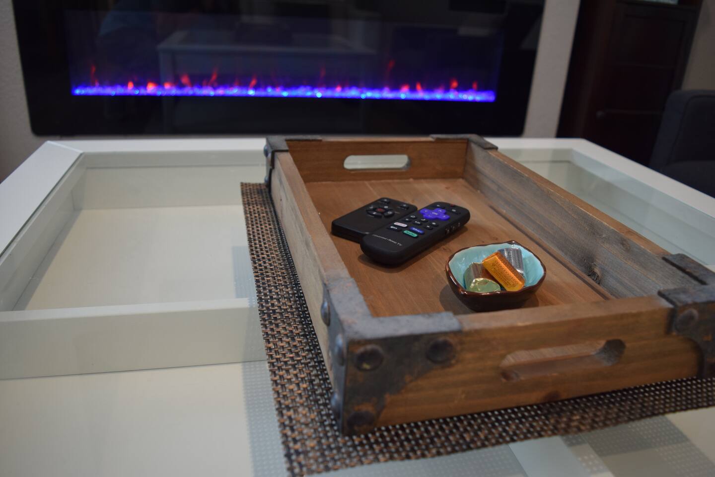 Kick back and relax in this calm, stylish space. The smart Roku TV with Vizio sound bar sit above an electric fireplace. The TV gives you access to all your steaming services. The full kitchen gives you the option to cook, or with the central location you can choose from the many nearby restaurants and bars. There is an awesome queen sized bed and large bathroom with a shower. The desk and monitor gives you the ability to work during your stay.